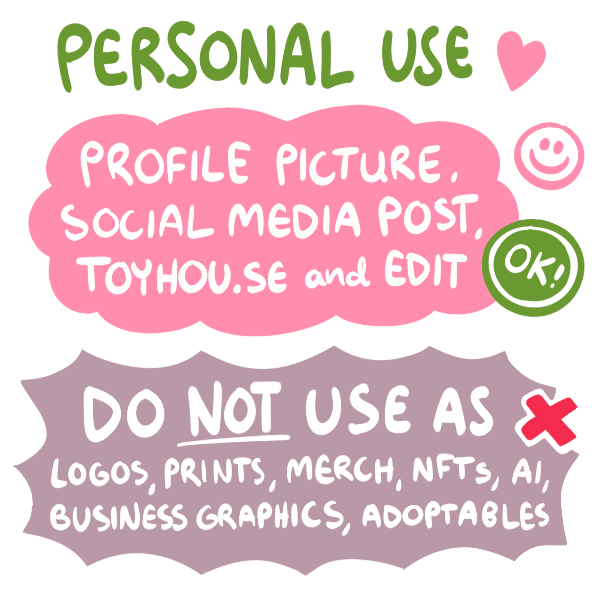 1. The name of the picrew is part of the design, so you don't have to worry too much about crediting when you post. But if you use a cropped version for your profile picture, it would still be nice of you to credit @hellosunnycore, or to name the picrew in your bio.2. You may edit your TOON ME! icon, as long as you don't remove or cover up my watermark and credit.3. Please refrain from selling adoptables that very closely resemble TOON ME! picrew designs. Taking inspiration is totally fine, but please respect how much love and care I put into designing all the items in these picrews, and don't just copy my work.4. You're welcome to redraw TOON ME! icons, but please say it's a redraw and either…