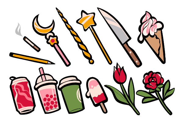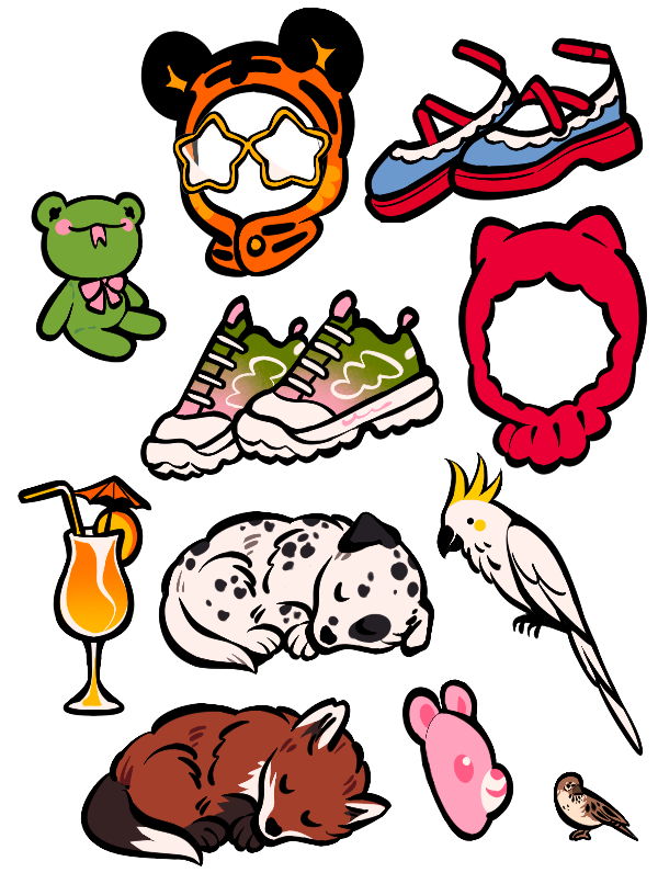 These ^ are just a few of the items I drew that didn't make it into the final picrew! They were supposed to be things the characters could hold in a raised hand, but I had to scrap the idea when I ran out of layers on the site. There was just nowhere I could put them without having to delete an entire other section.